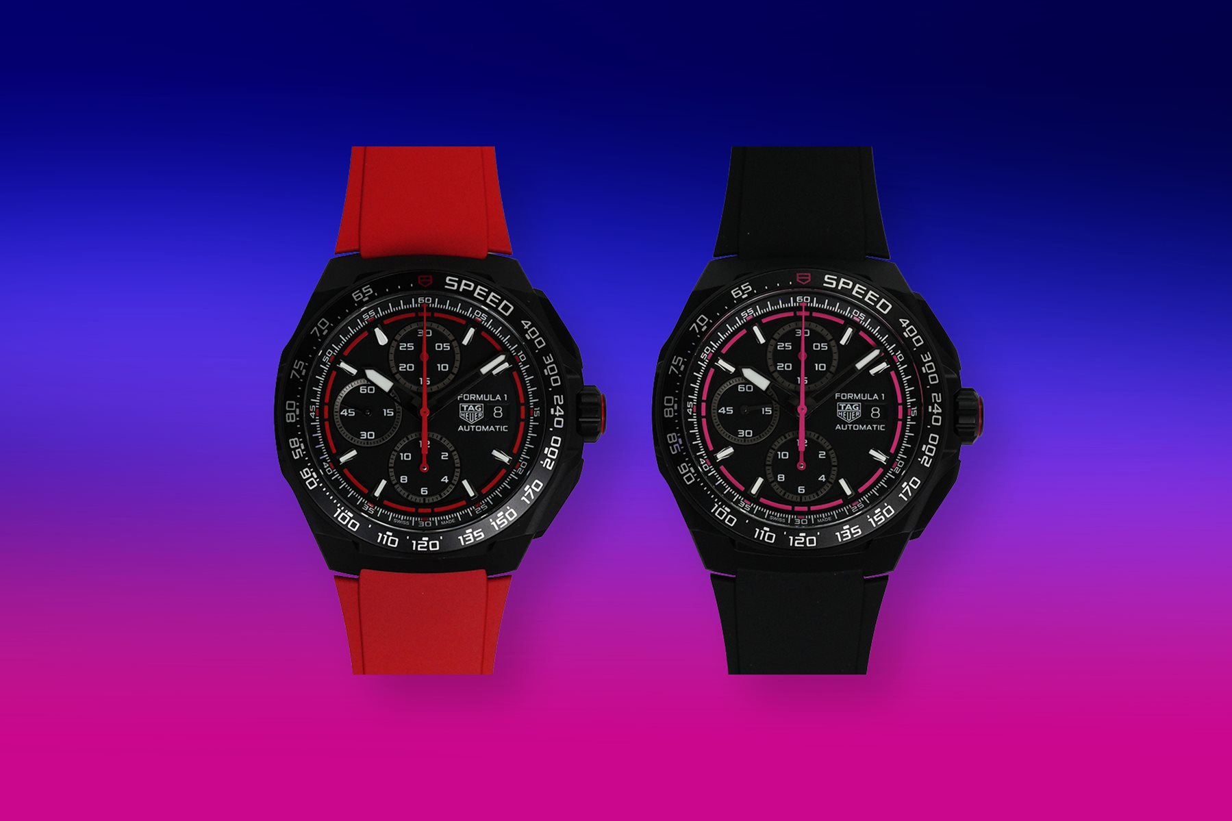 - One (1) x Tag Heuer Formula 1 Chronograph Automatic Watch 44mm DLC, Titanium Case Black and Pink Dial on Rubber Strap; OR